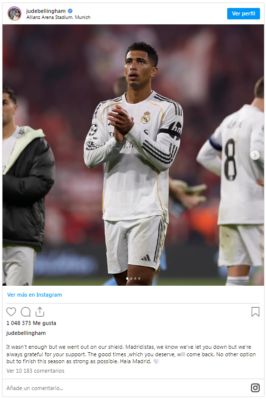 Jude Bellingham rompió el silencio tras la eliminación del Real Madrid en la Champions League y dejó un mensaje dirigido a la afición blanca, en medio de las críticas por la temporada irregular del equipo de Carlo Ancelotti.
